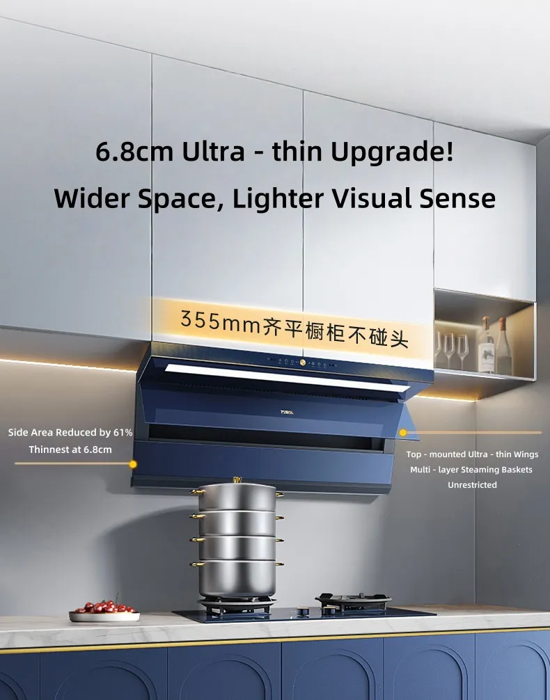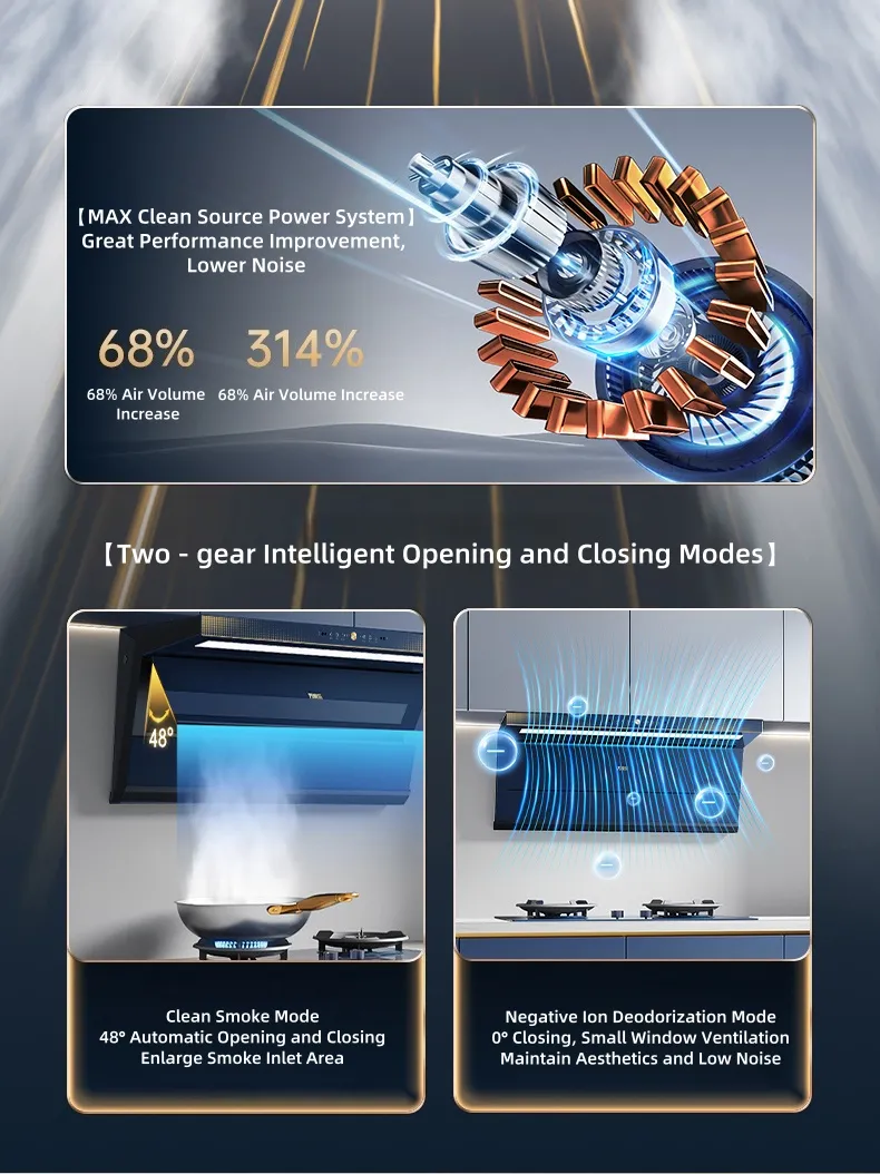 Эта вытяжка может похвастаться 7-образной конструкцией с двойным всасыванием (днище 41 мм, высота встраивания в корпус 355 мм, толщина 6,8 см) и стильным корпусом синего цвета со звездным сиянием. Оснащенный системой Zero - Motion Smart Clean 2.0 (постоянный объем воздуха с рычагом и инвертором), воздуховодом 2.0 с большой спиралью, он обеспечивает подачу воздуха для тушения пожара объемом 28,5 м3/мин, сверхстатическое давление 1200 Па и низкий уровень шума на 50 дБ. Такие функции, как очистка отрицательными ионами, электрическая заслонка, очистка нанопокрытием и мягкая яркая подсветка 835-миллиметровой ступени, повышают производительность и удобство использования.