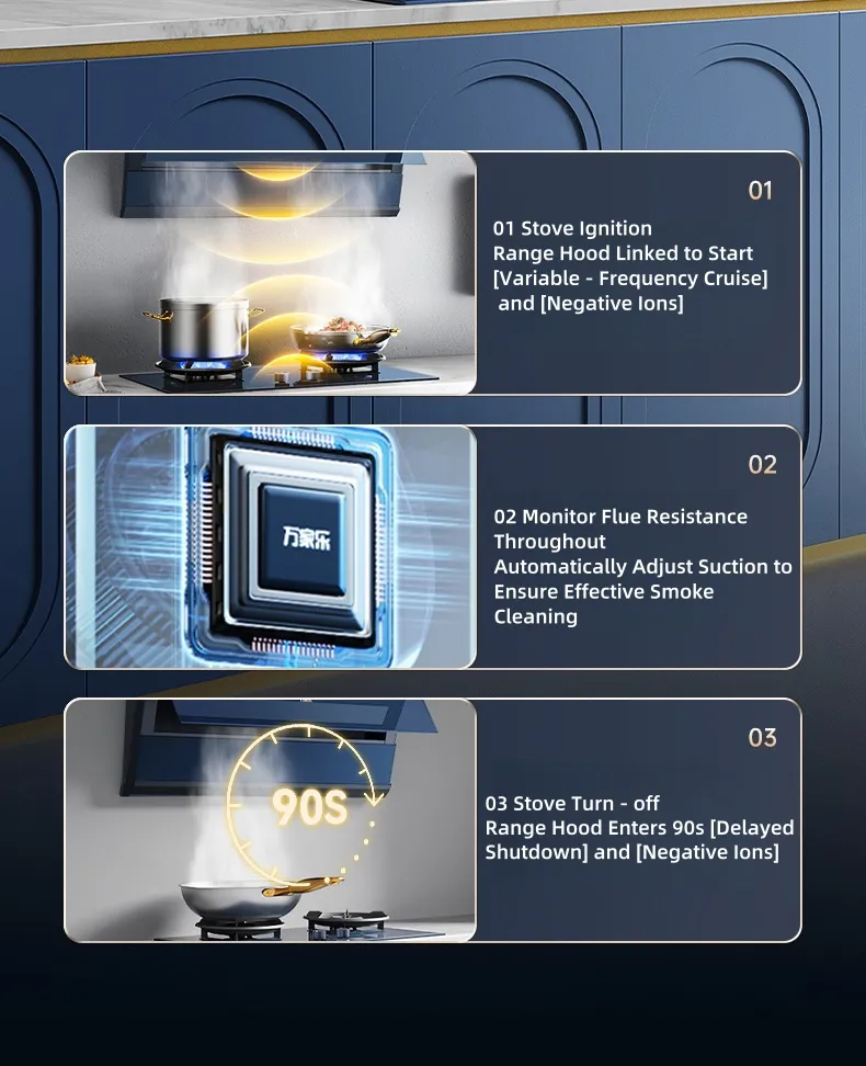 | Размеры упаковки | 996×419×981 | Уровень шума при работе | 68,5 дБ (A) | Другие функции электронного управления | Подключение вытяжки и плиты + Отрицательный ион + Напоминание о заливке масла + Экран блокировки очистки |