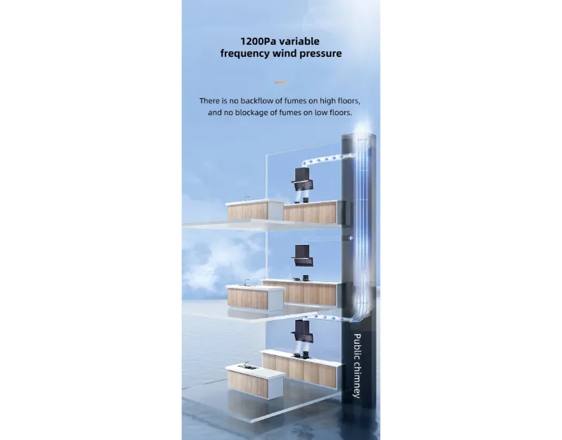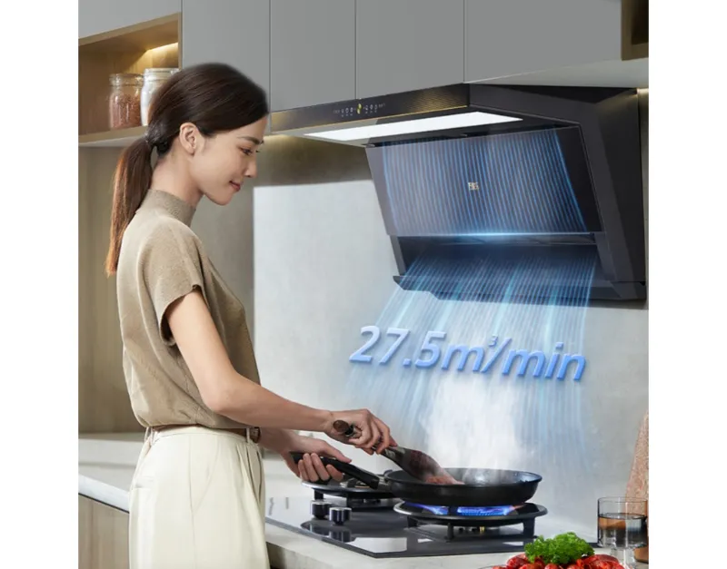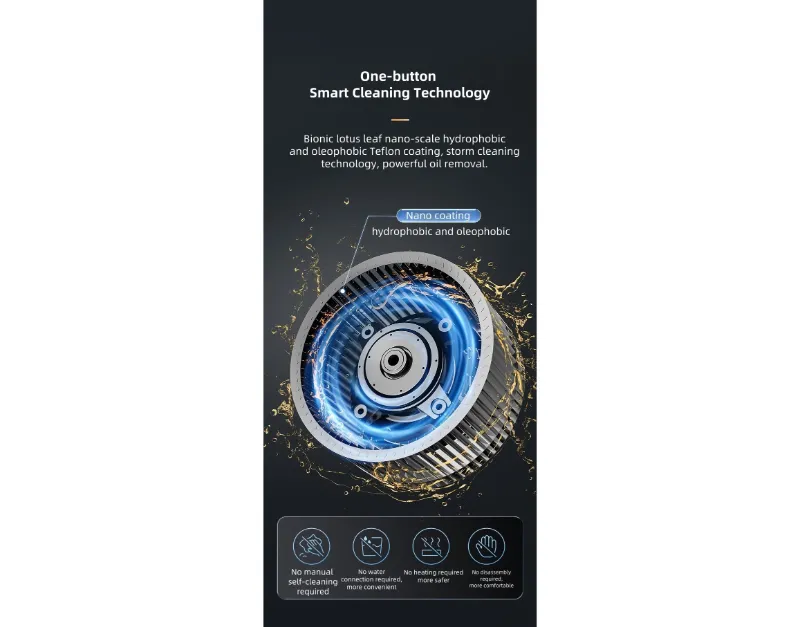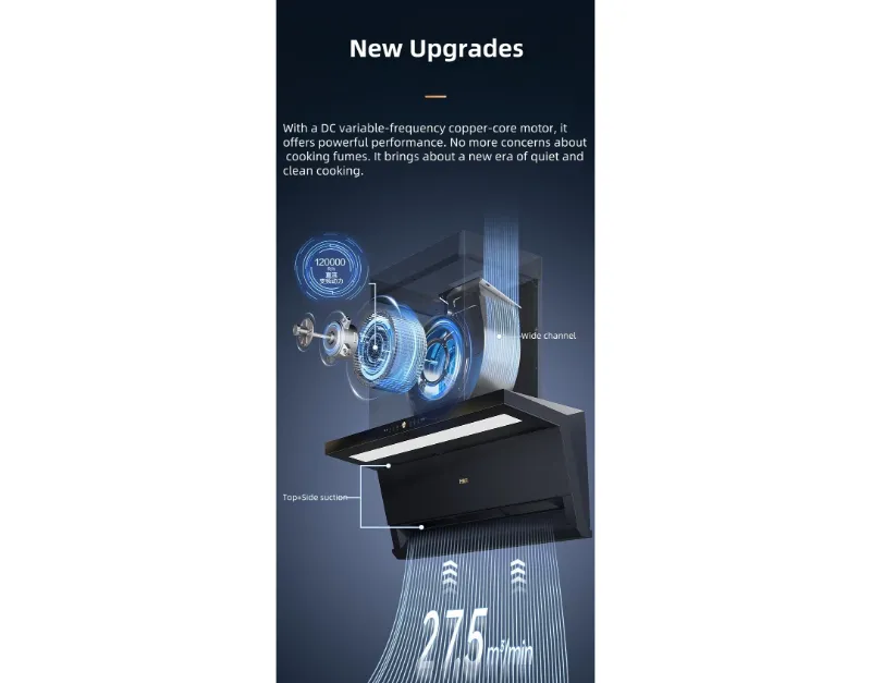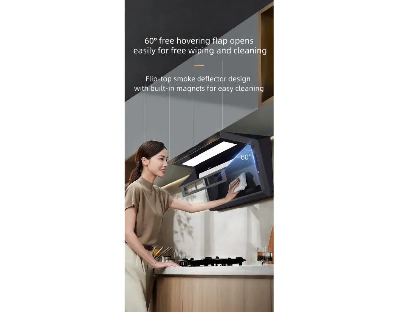 Вытяжка оснащена системой всасывания сверху и сбоку для эффективного улавливания дыма, а крыльчатка с нанопокрытием обеспечивает интеллектуальную самоочистку для длительной работы. Функция круиз-контроля автоматически регулирует поток воздуха для оптимальной вентиляции. Передняя стеклянная панель легко поднимается для удобства доступа.