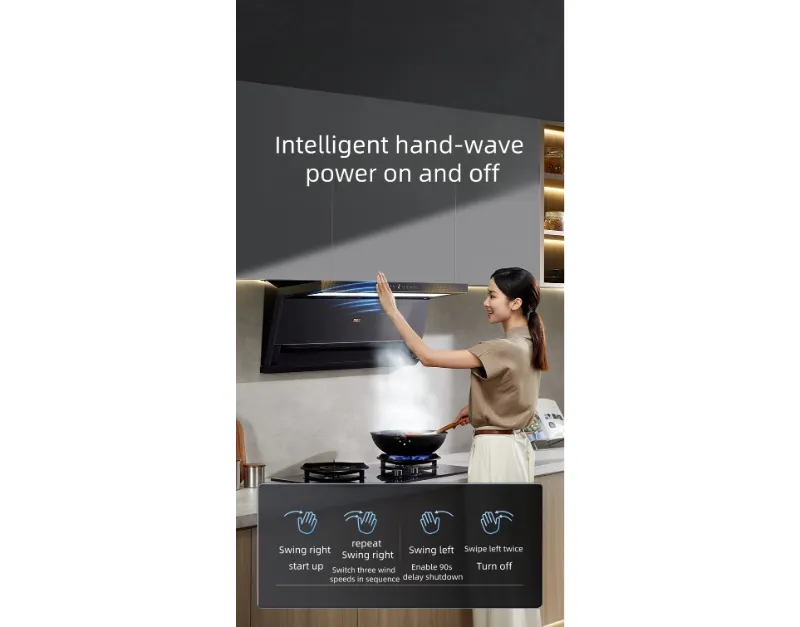 К дополнительным интеллектуальным функциям относятся: блокировка экрана (предотвращает случайные прикосновения во время уборки), напоминание о заливке масла и таймер отсрочки выключения. Максимальный расход воздуха составляет 1700 м3/ч, а уровень шума составляет 50 дБ, что обеспечивает тихую и в то же время мощную работу на кухне. Сенсорное управление и управление жестами, а также трехскоростные настройки + круиз-контроль обеспечивают легкость управления. Изготовленный из оцинкованной стали, он сочетает в себе долговечность и элегантный дизайн.