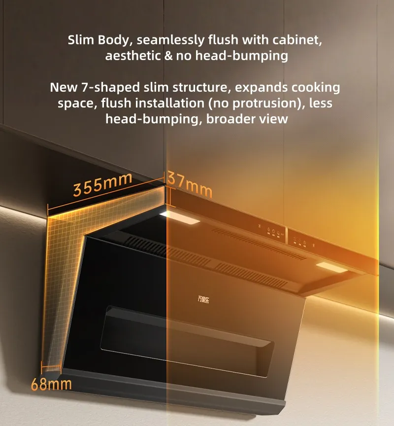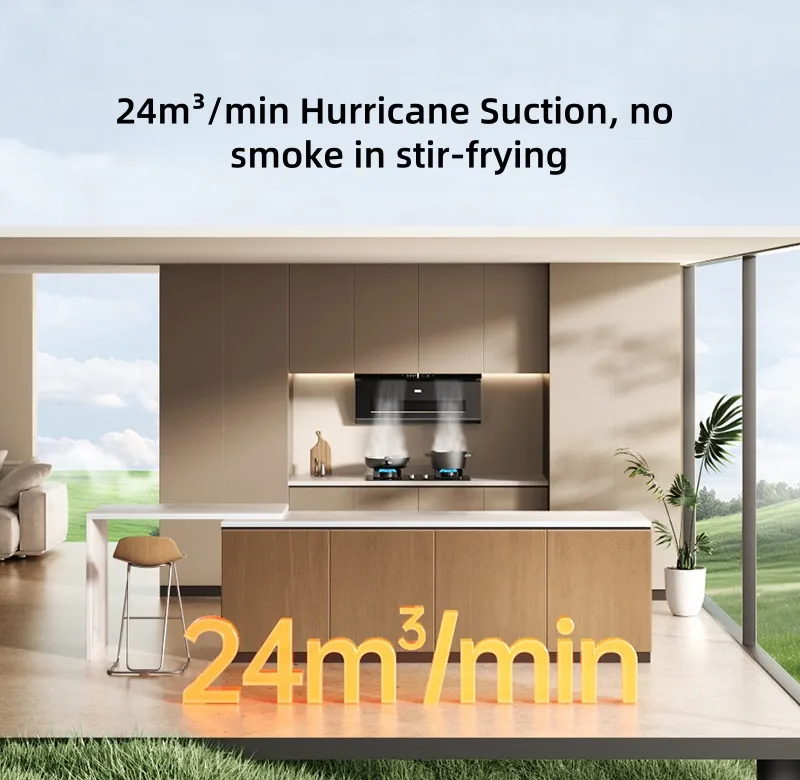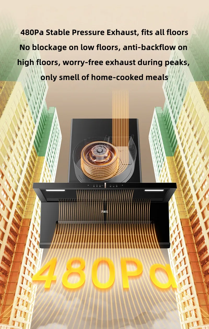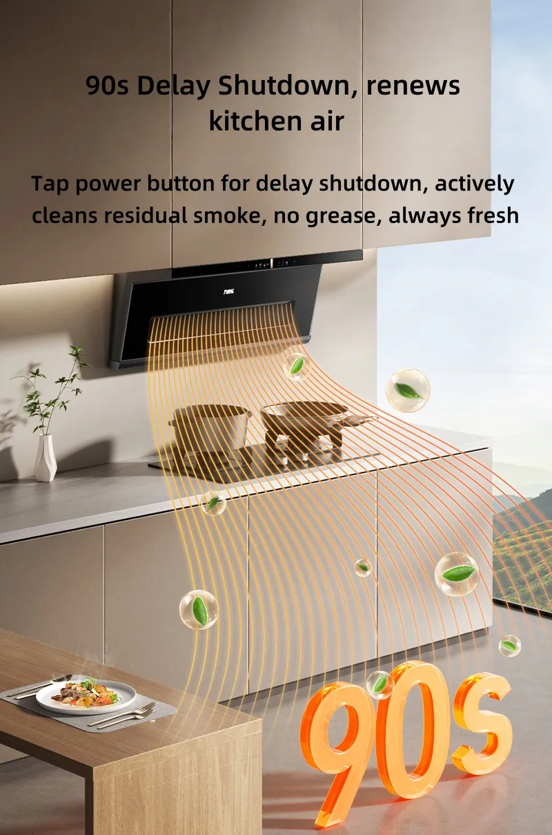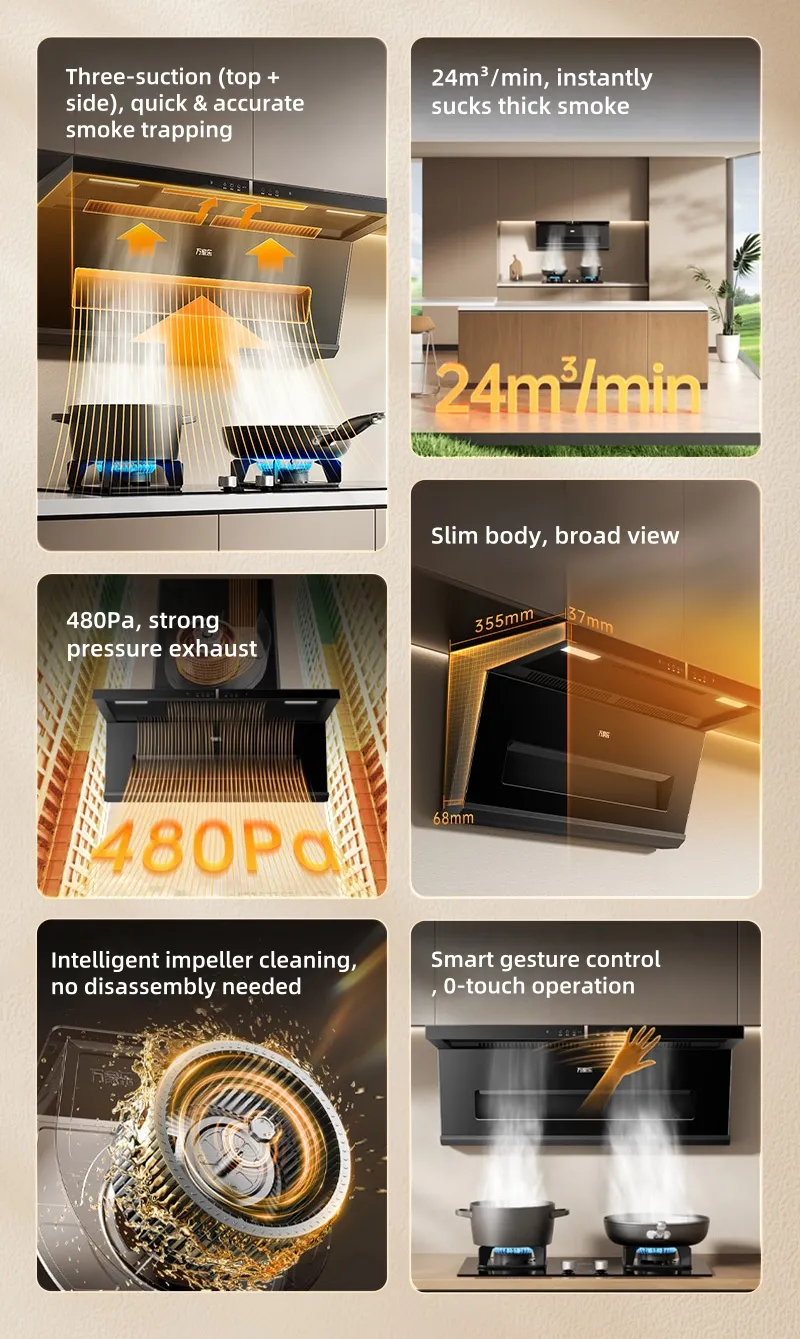 Эта вытяжка сочетает в себе двойное всасывание сверху и сбоку для эффективного улавливания дыма — низкое положение вытяжки сразу же улавливает дым, в то время как высокое положение вытяжки задерживает поднимающийся дым. Благодаря мощному всасыванию объемом 24 м3 и статическому давлению 480 Па она легко справляется с испарениями от жарки. Такие функции, как самоочищающееся ветроколесо, тонкий дизайн диаметром 355 мм, полноэкранное стекло, большая емкость для масла, функция отложенного выключения, три настройки скорости и управление жестами, обеспечивают удобство, долговечность и свежесть на кухне.