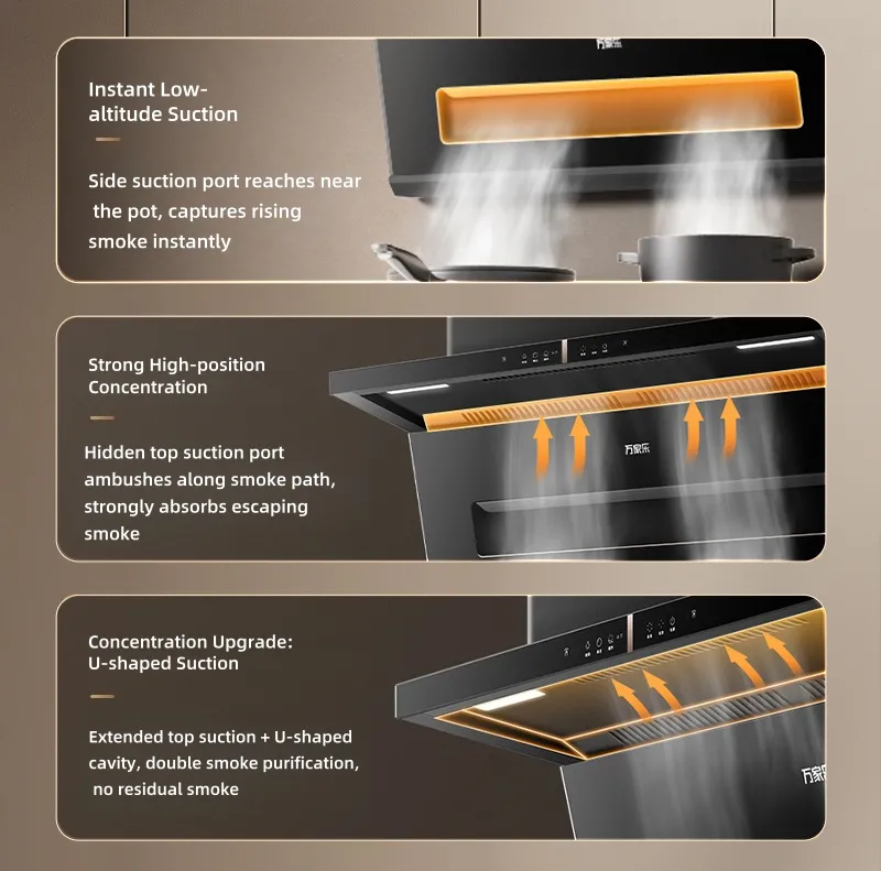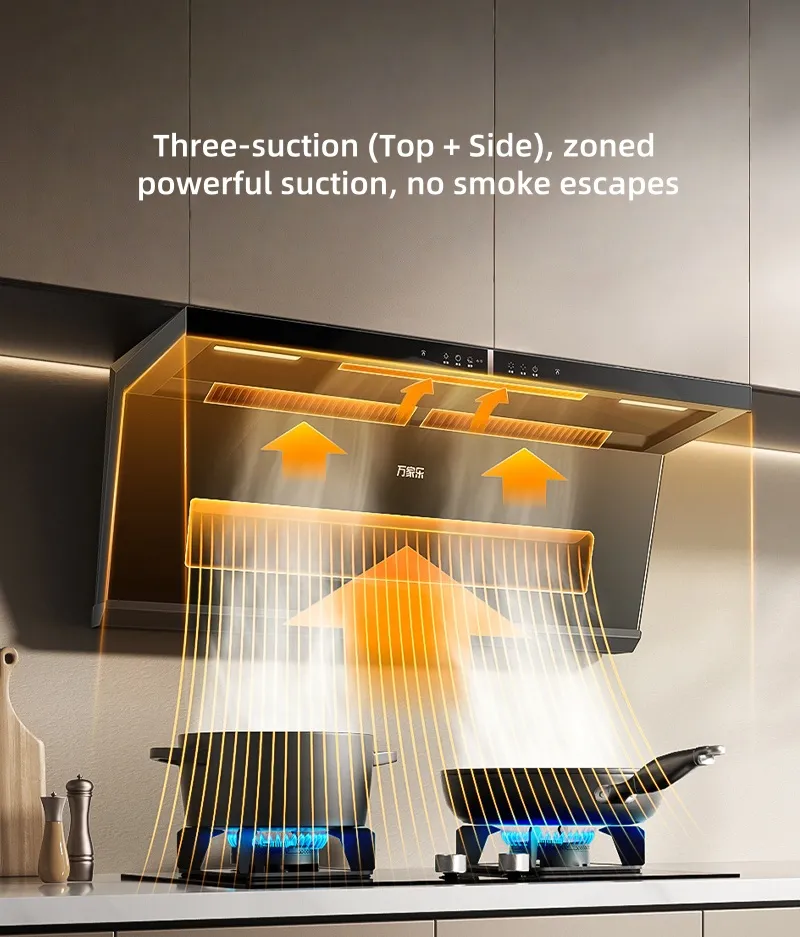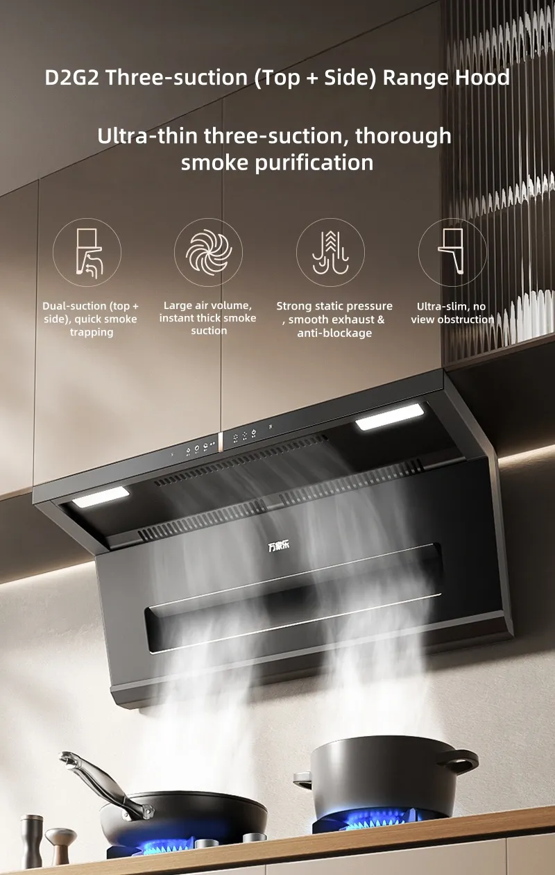 Ультратонкая вытяжка с тремя всасывающими отверстиями сверху и сбоку - Эффективно очищает дым, тщательно всасывает и выпускает пар