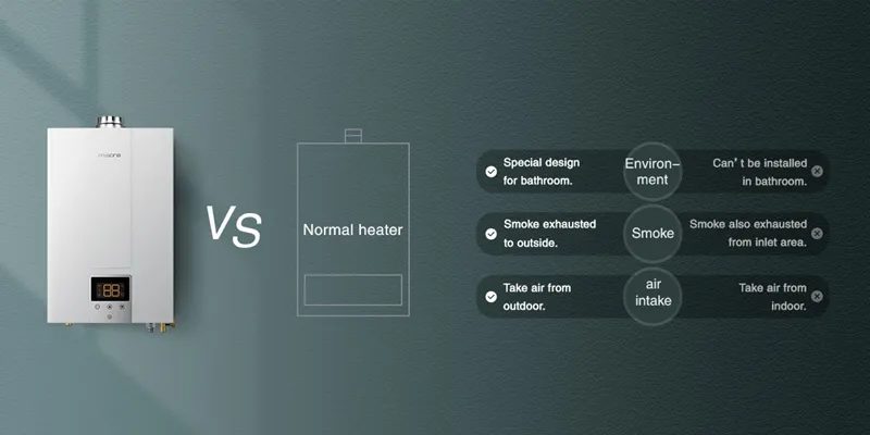 Газовый водонагреватель с принудительной тягой использует вентилятор для отвода газов сгорания наружу. Для этого требуется вытяжной канал, подключенный снаружи. В отличие от этого, газовый водонагреватель балансного типа имеет герметичную камеру сгорания. Он втягивает наружный воздух для сжигания и выводит газы наружу через коаксиальный дымоход. Это делает его более безопасным для установки в помещениях с ограниченной вентиляцией, так как он не потребляет внутренний воздух для сжигания.
