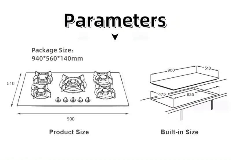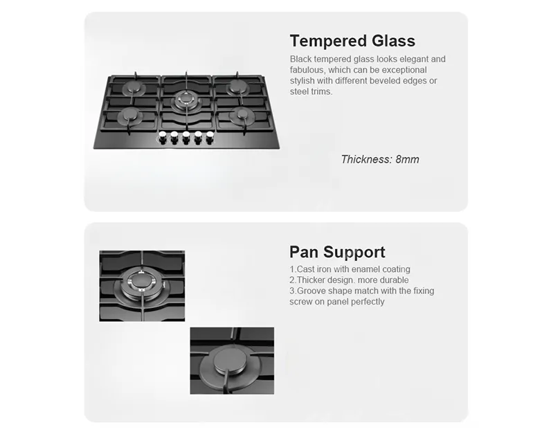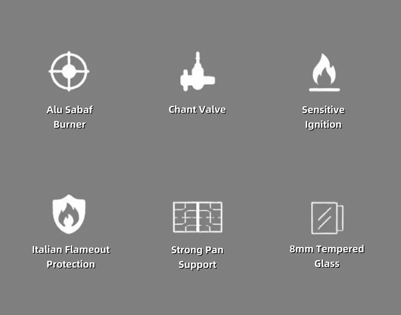 Благодаря прочной панели из закаленного стекла и чугунному поддону с матовой эмалью, эта плита сочетает в себе стиль и надежность. Ручка из цинкового сплава обеспечивает точное управление, а дополнительная защита от воспламенения и розжиг постоянного/переменного тока повышают безопасность и гибкость. Благодаря универсальной тепловой нагрузке (3,2 кВт + 2,5 кВт + 1,75 кВт × 2 + 1,0 кВт) она подходит для многозадачного приготовления пищи, эффективному смешиванию продуктов и современному дизайну.