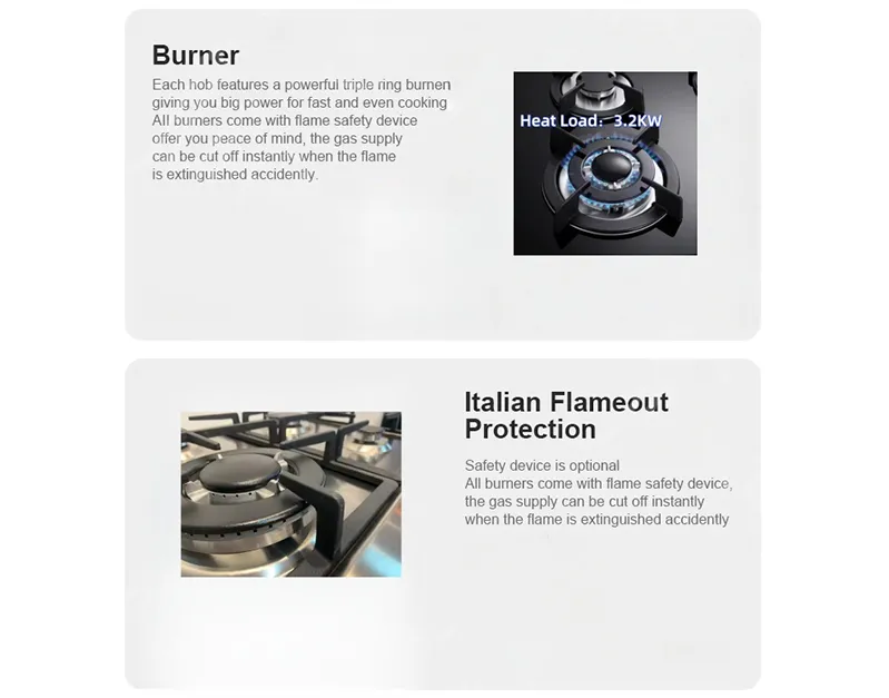 Каждая конфорка оснащена мощной трехконфорочной конфоркой, обеспечивающей высокую мощность для быстрого и равномерного приготовления пищи. Все конфорки оснащены противопожарным устройством, которое гарантирует вам спокойствие, подача газа может быть мгновенно отключена при случайном погасании пламени.