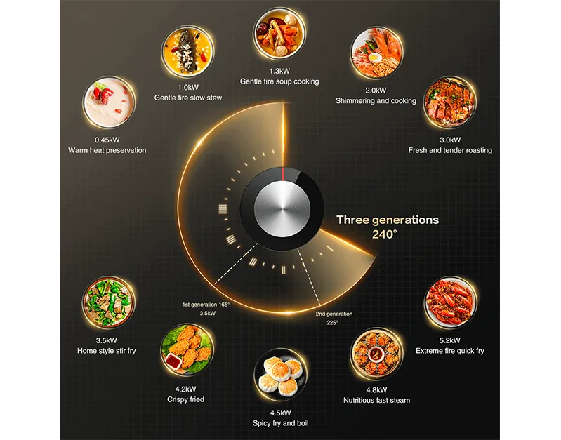 Увеличьте диапазон регулировки на 75°, чтобы добиться точной настройки мощности от 0,45 до 5,2 кВт. Профессиональный шеф-повар star chef обеспечивает точное управление огнем и возможность приготовления блюд по различным рецептам.