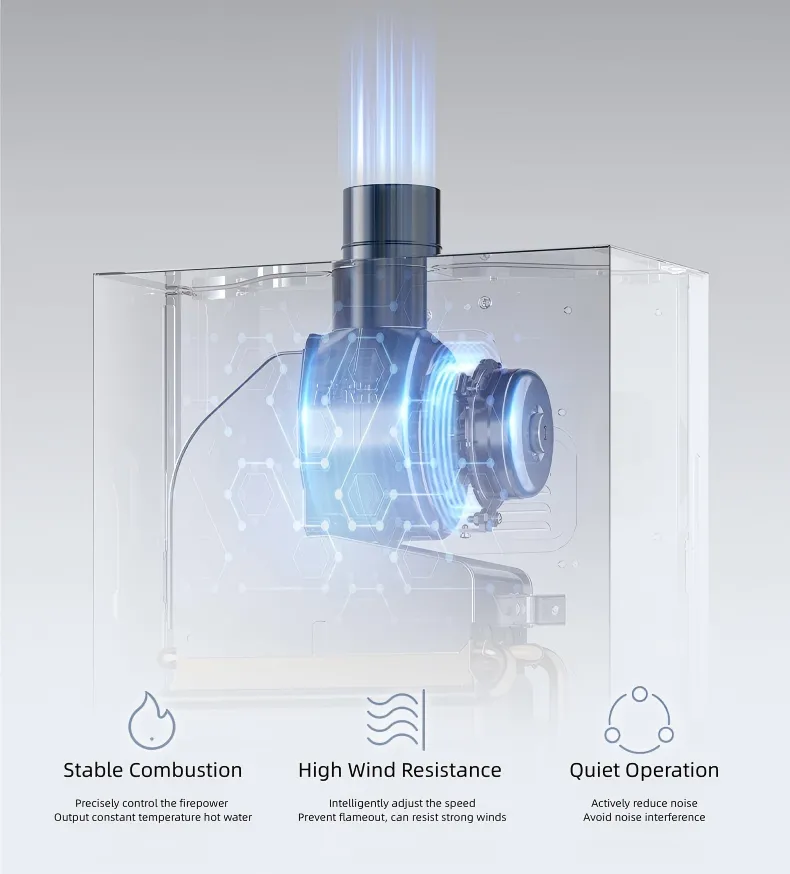 Оснащенный вентилятором постоянного тока с регулируемой частотой вращения, он может разумно регулировать скорость вращения вентилятора, обеспечивая достаточное и стабильное сгорание.