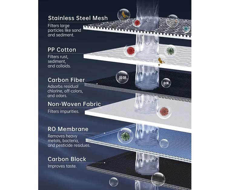 Сочетает в себе фильтрующую мембрану RO с предварительно активированным углем для точной фильтрации бактерий и тяжелых металлов.