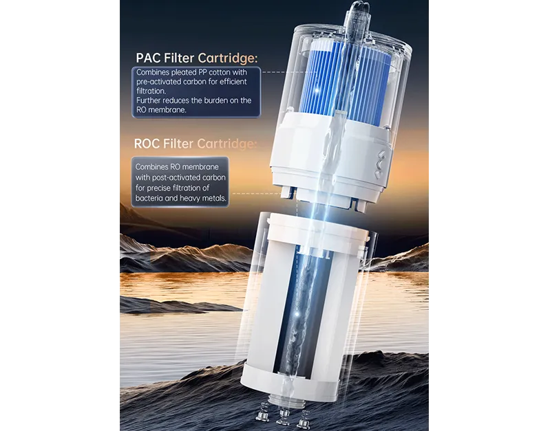 Фильтрующий картридж 2-в-1 включает в себя PAC-фильтр (срок службы 12 месяцев) и RO-мембрану (срок службы 36 месяцев), что обеспечивает длительную очистку.
