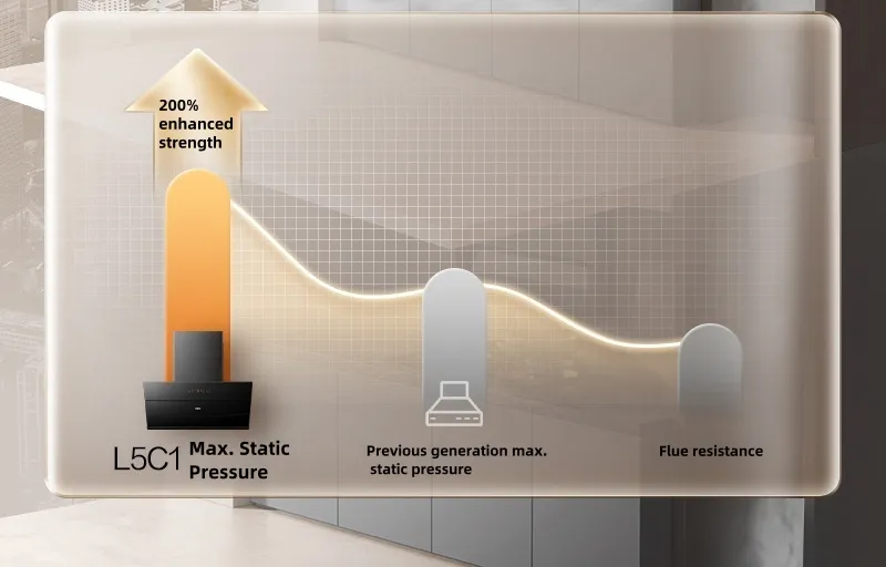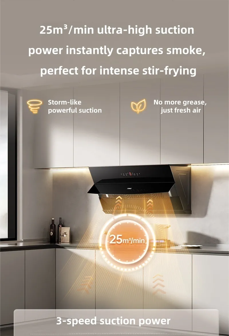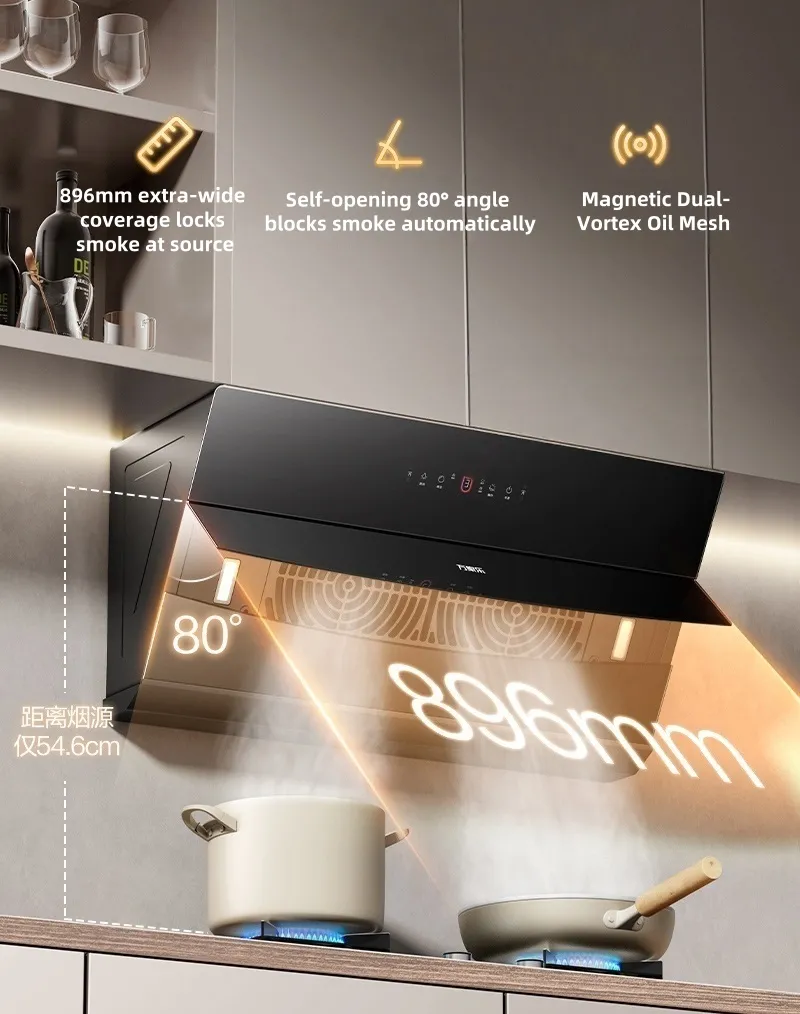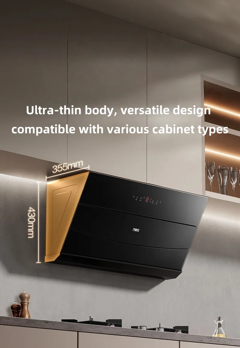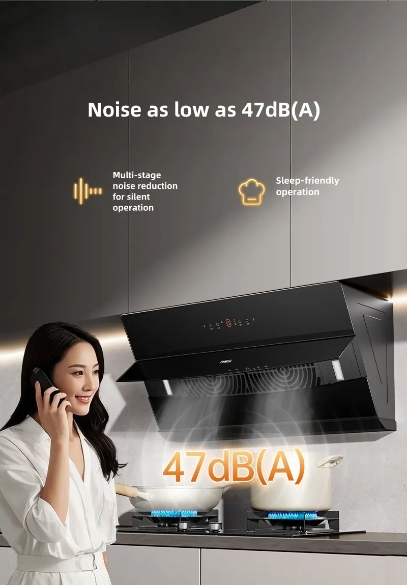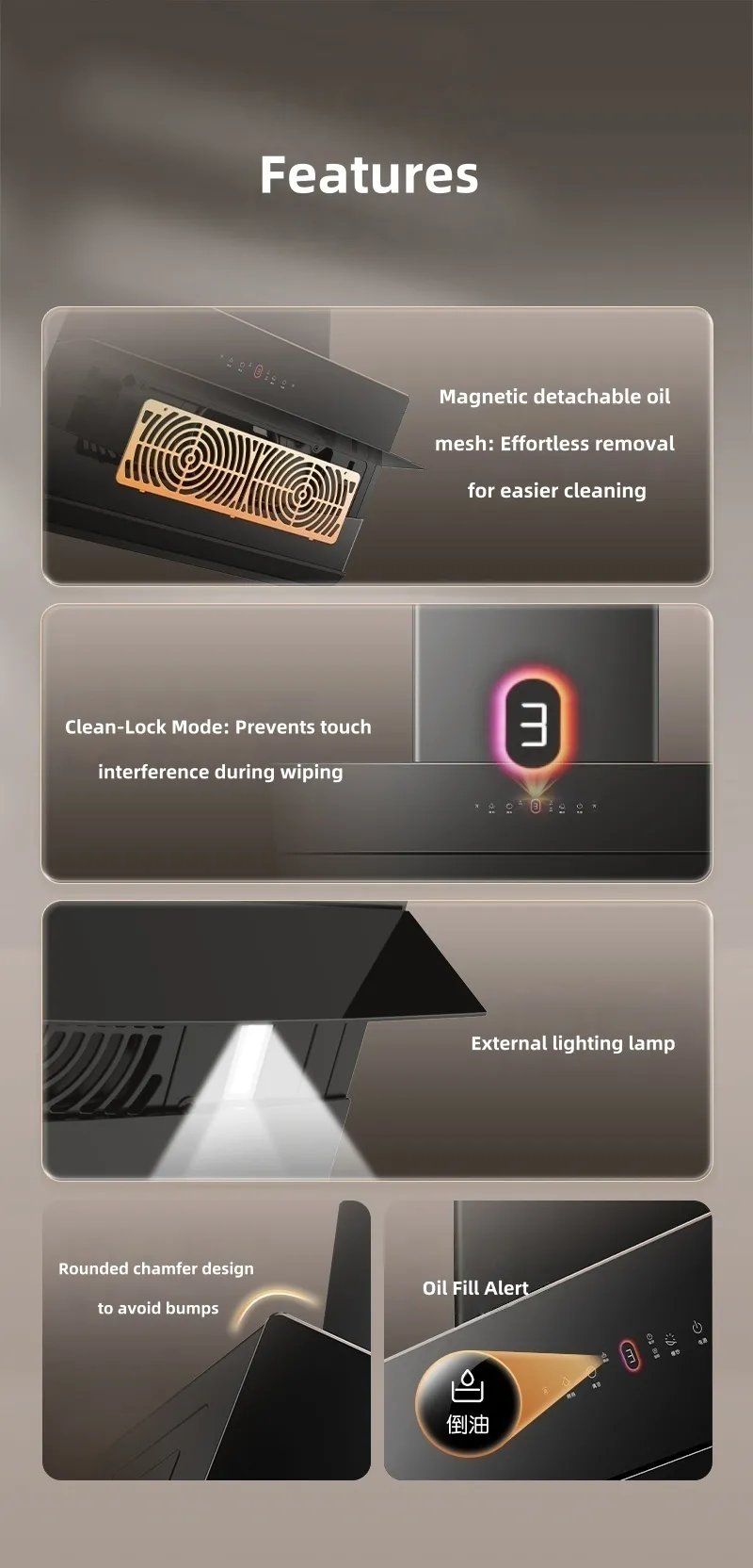 Вытяжка имеет большой объем воздуха 25 м3, статическое давление 500 па и дымозащитный экран диаметром 896 мм для эффективного поглощения дыма. Благодаря интеллектуальному соединению, крыльчатке с нанопокрытием и магнитному масляному экрану ее легко чистить. Сверхшумный (47 дБ), компактный (глубина 355 мм) и безопасный благодаря округлому дизайну. Емкость для масла объемом 1,85 л сокращает время работы.