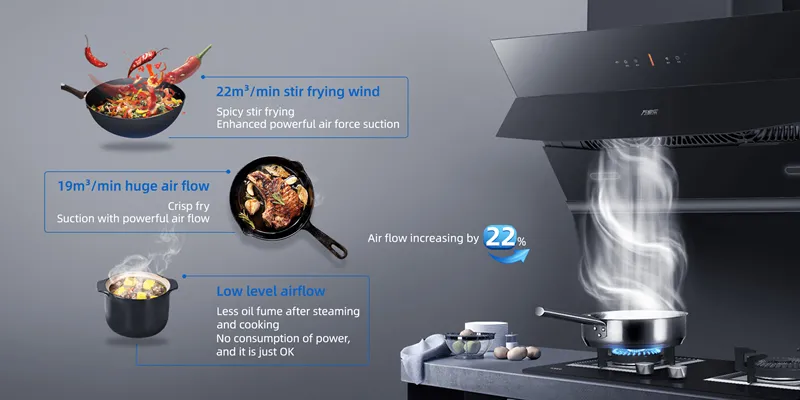 в 22 м3 мгновенно выводит наружу даже густые пары масла, характерные для сычуаньской кухни, которые легко