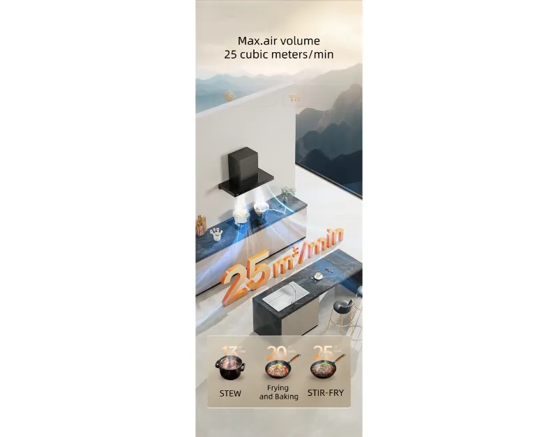 Вытяжка оснащена крыльчаткой с нанопокрытием и интеллектуальной технологией самоочистки, что облегчает техническое обслуживание. Интеллектуальная регулировка давления всасывания автоматически оптимизирует поток воздуха, а соединение вытяжки с варочной панелью обеспечивает синхронизацию работы с вашей варочной панелью. Быстроразъемная присоска облегчает очистку, а такие удобные функции, как отсрочка выключения, напоминание о наличии масла и подсветка верхней панели, улучшают качество приготовления.