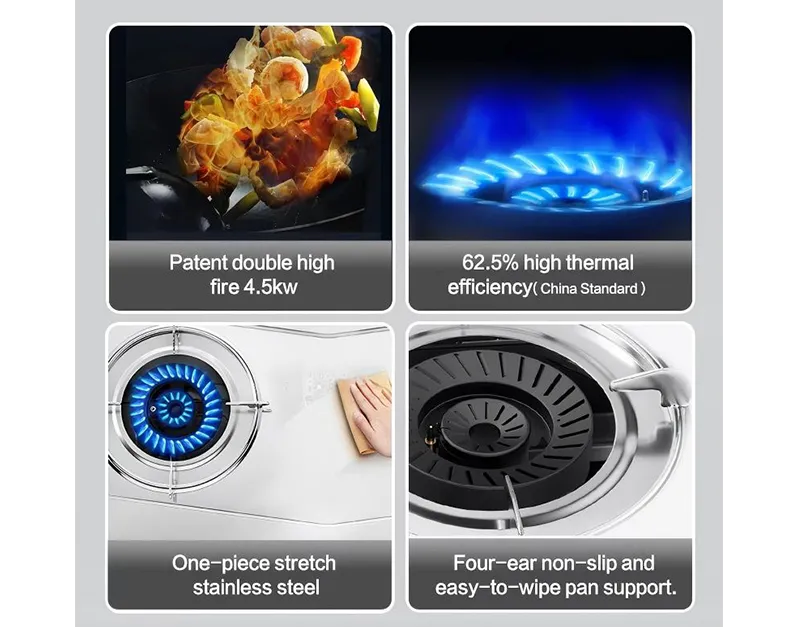 Эта газовая плита сочетает в себе производительность и долговечность с энергоэффективностью 2-го класса, обеспечивая снижение энергопотребления без ущерба для мощности. Благодаря высокой выходной мощности в 5,0 кВт она обеспечивает быстрый нагрев для различных видов приготовления - от жарки на сильном огне до тушения на медленном огне. Безопасность является приоритетной задачей благодаря множеству защитных функций, включая автоматическое обнаружение возгорания для предотвращения утечки газа.